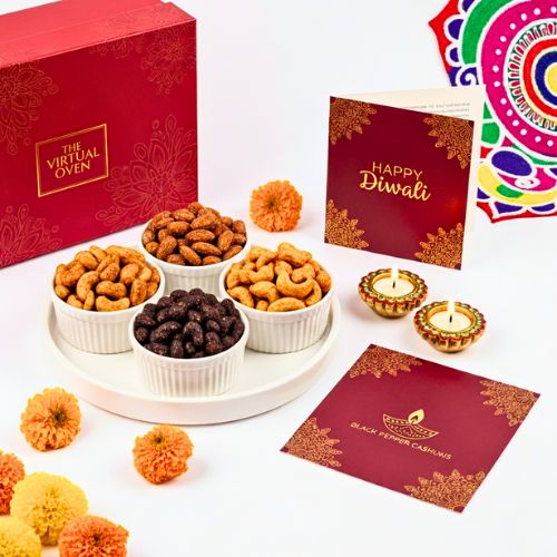 Celebrate the festival of lights with a luxurious touch by gifting this Festive Delight Diwali Gift Hamper. Elegantly curated, this hamper brings together a gourmet collection of flavored dry fruits, perfect for indulging in the spirit of Diwali. Housed in a vibrant festive box with traditional patterns, the hamper also includes a beautifully designed βHappy Diwaliβ greeting card, making it a heartwarming present for family, friends, or colleagues.