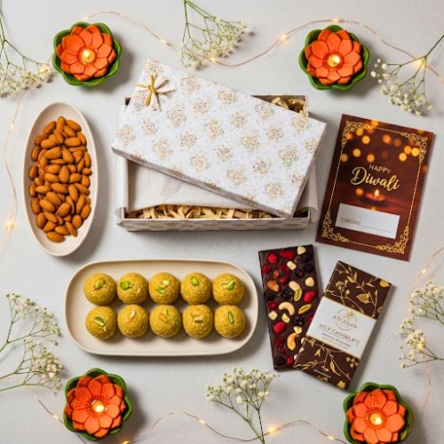 Inside this elegant box lies a handpicked assortment of classic besan ladoos, premium roasted almonds, and luxurious artisan chocolate barsβblending the charm of Indian mithai with the rich decadence of modern chocolates. Whether you’re gifting loved ones, colleagues, or clients, this box radiates thoughtfulness, quality, and festive cheer.