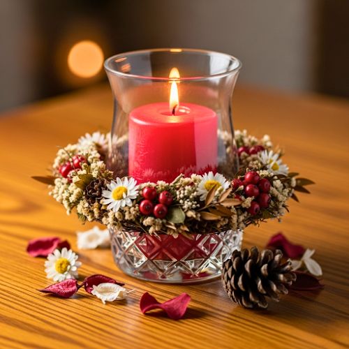Add a warm, cozy touch to your home with our Rustic Red Glass Candle, beautifully accented with a handcrafted dried floral wreath. Perfectly nestled in a clear glass holder, this vibrant red candle brings elegance and charm to any space. The delicate wreath features a seasonal blend of dried white, cream, and burgundy florals, along with natural twigs and leaves that highlight the candleβs radiant glow.